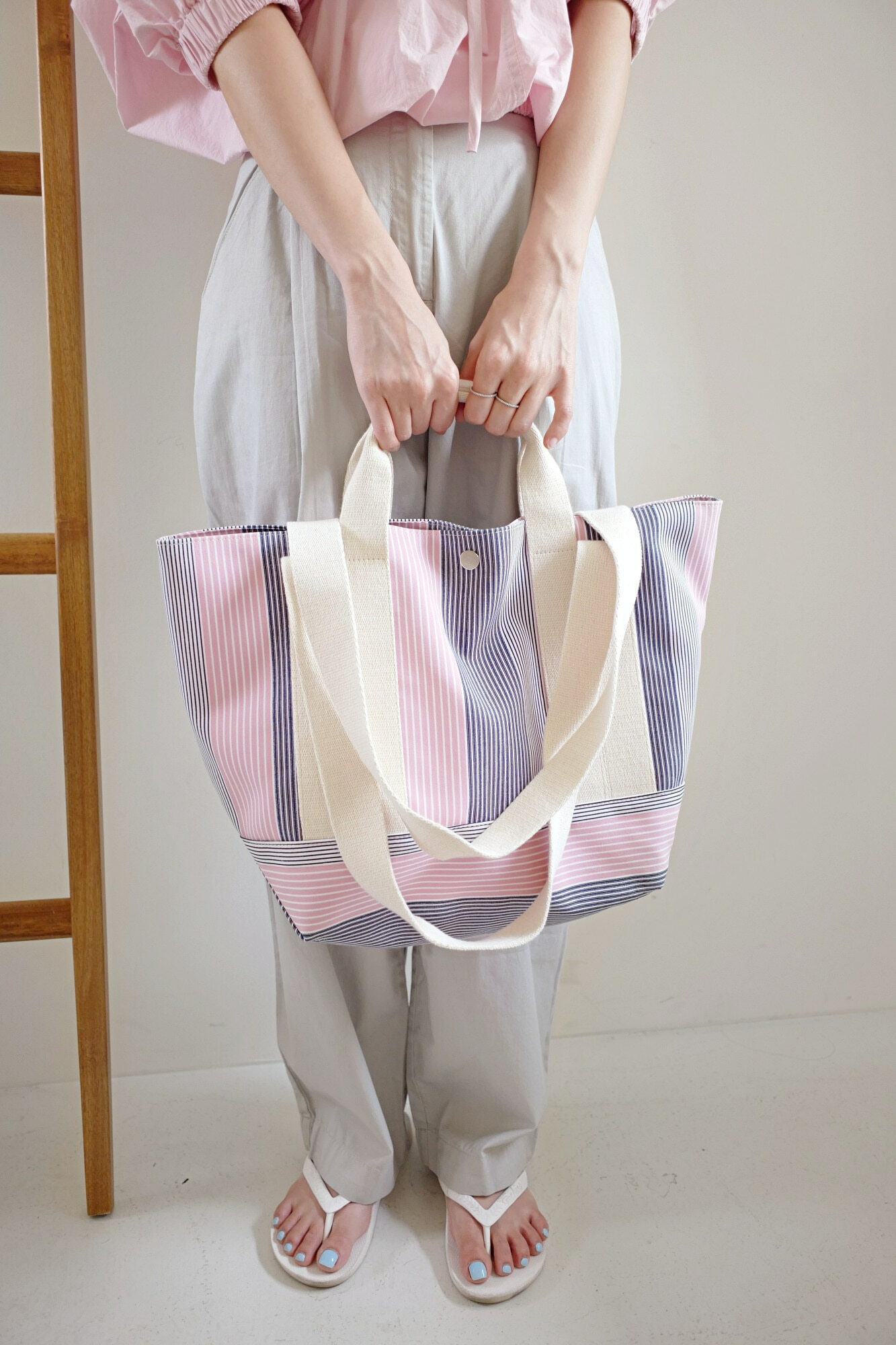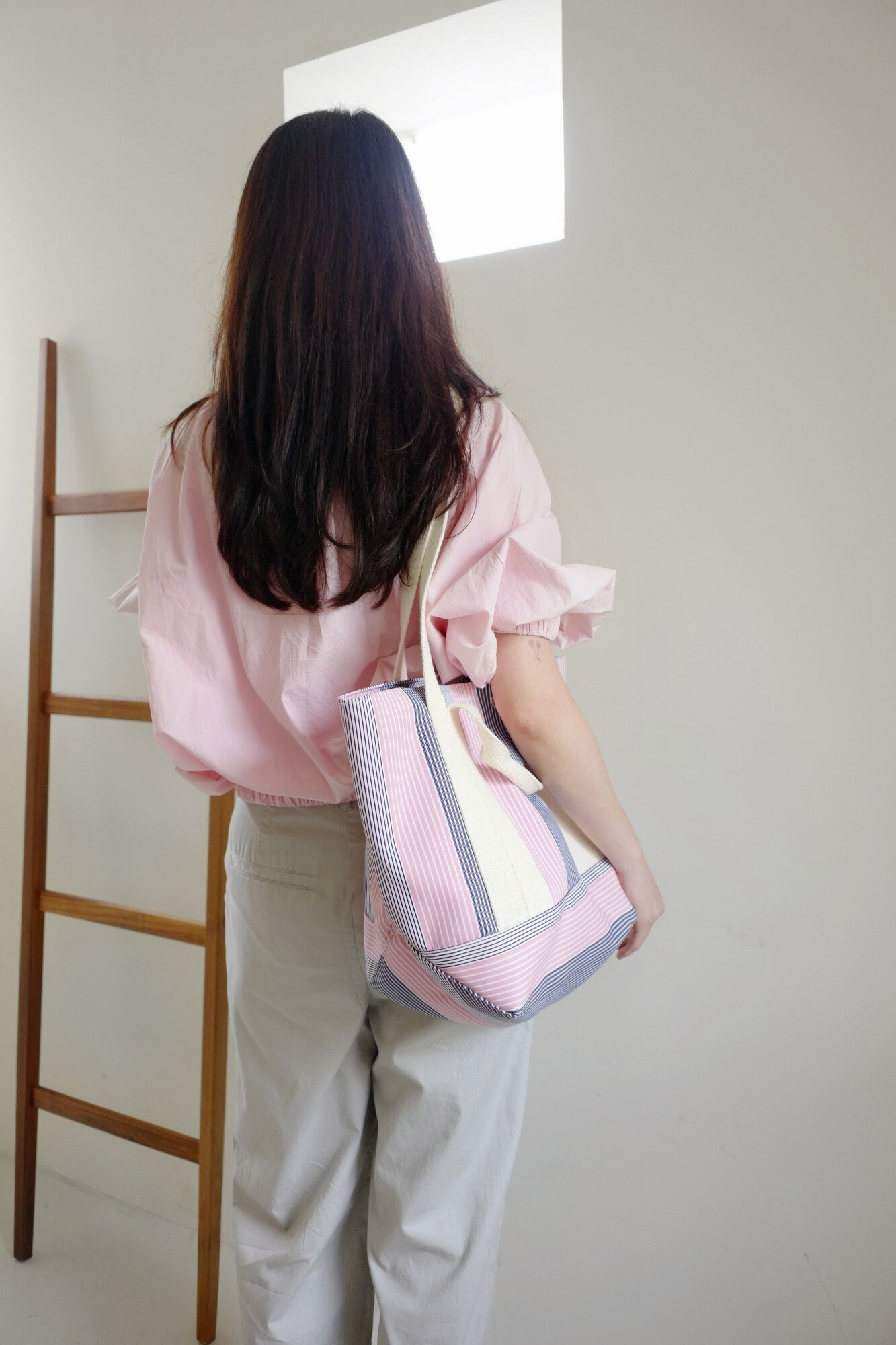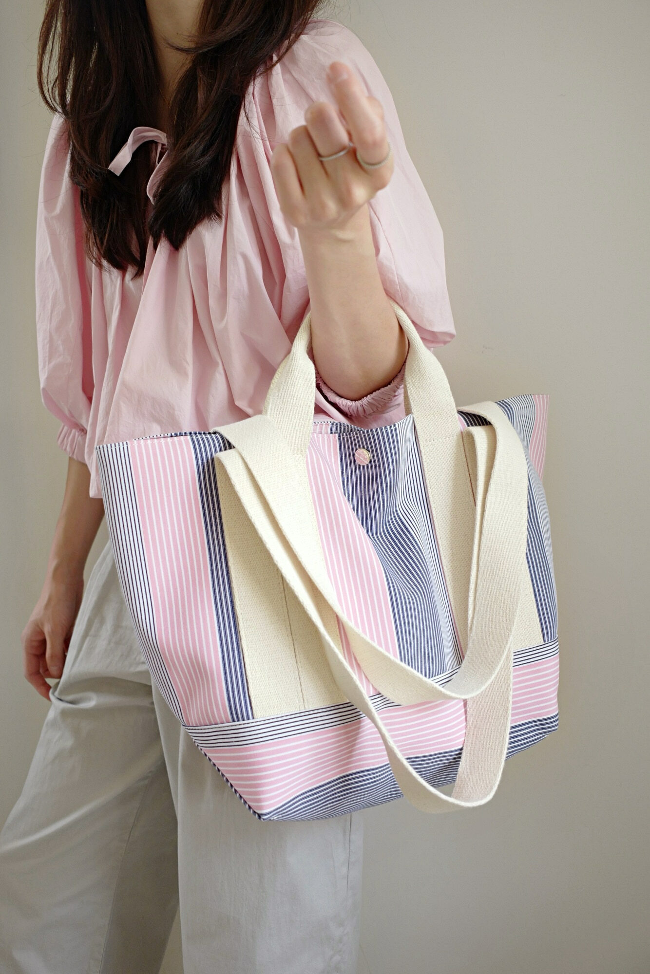 佢布料係韓國訂製,用上不同既條子布織出黎