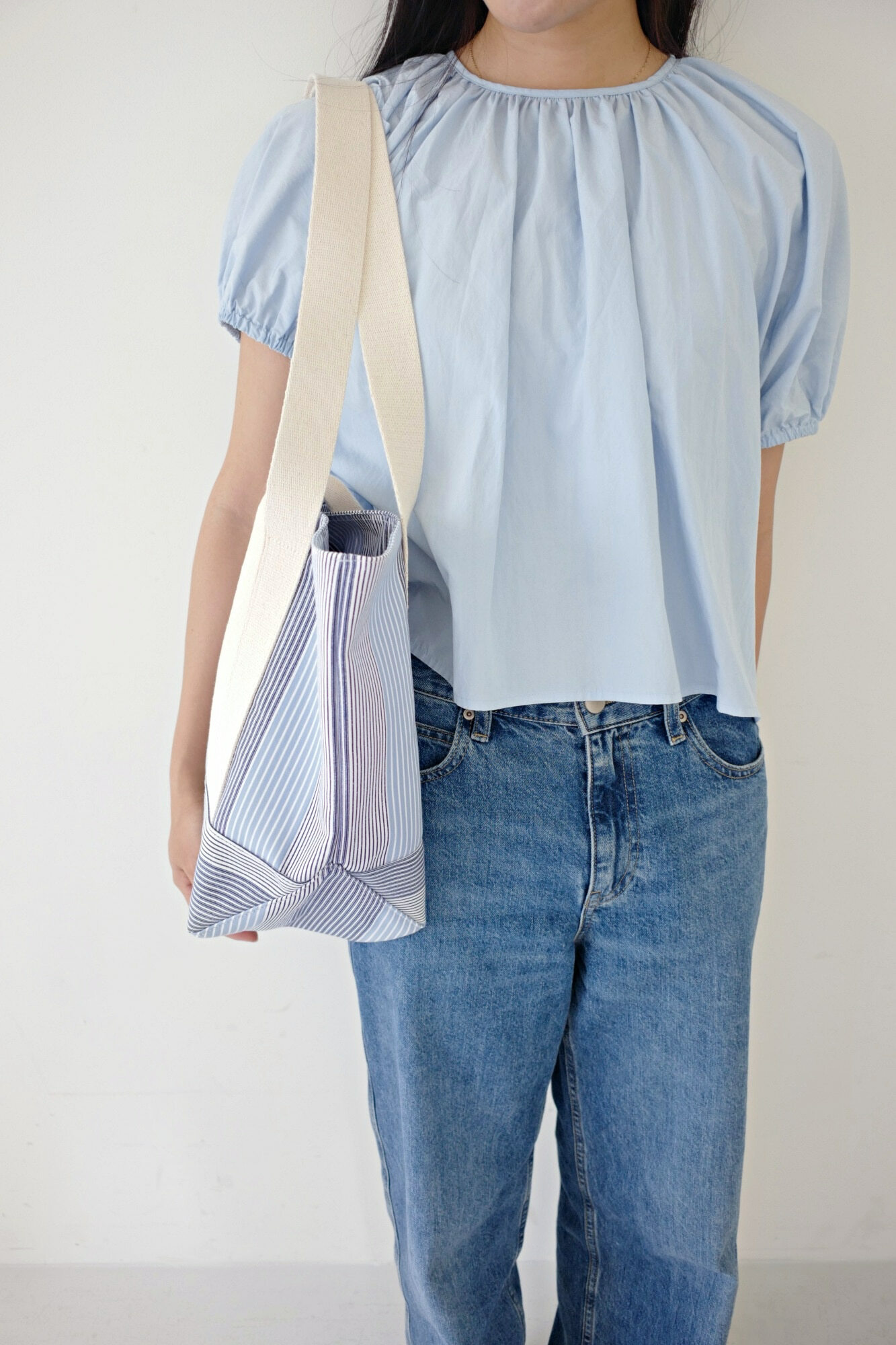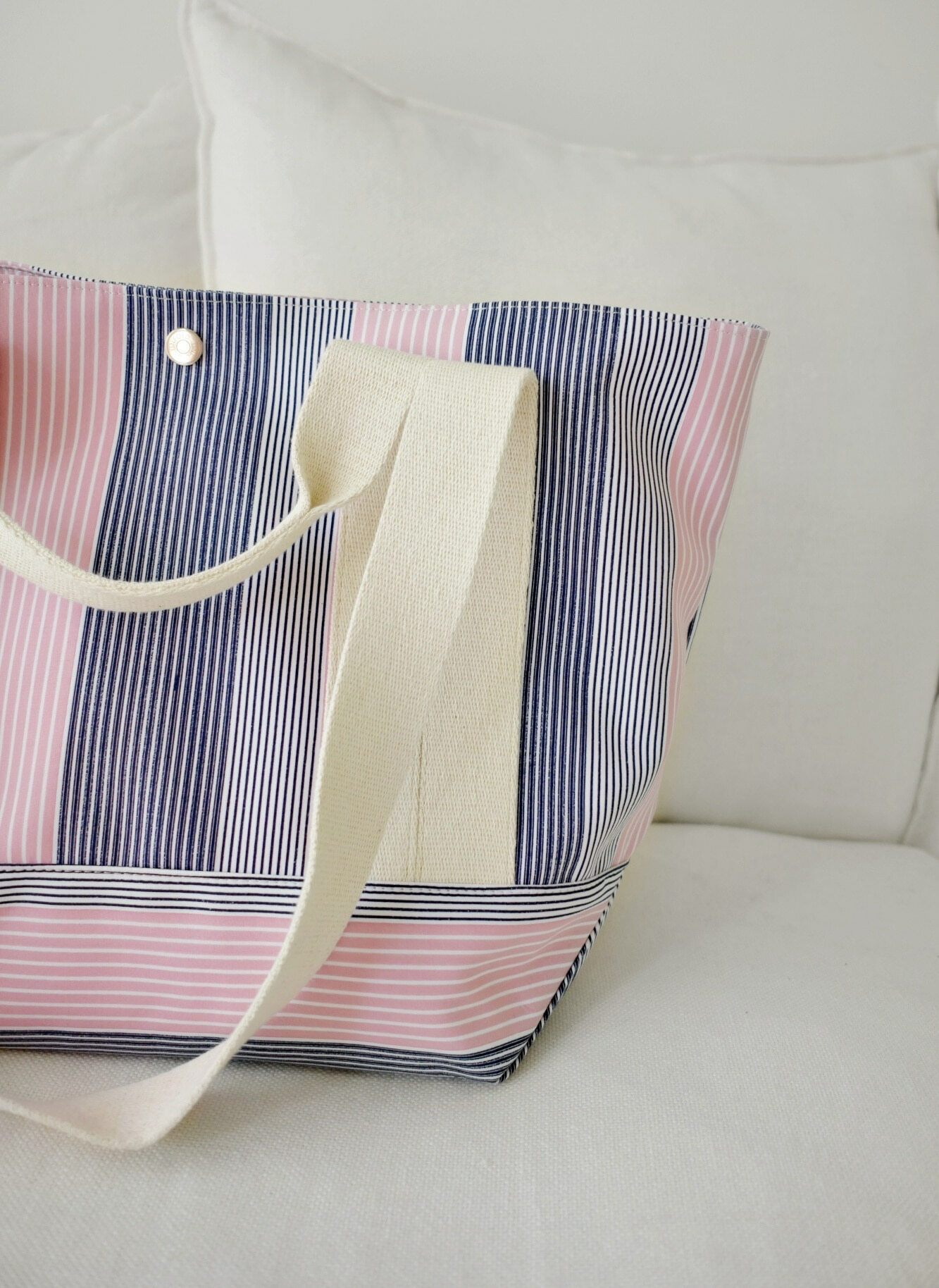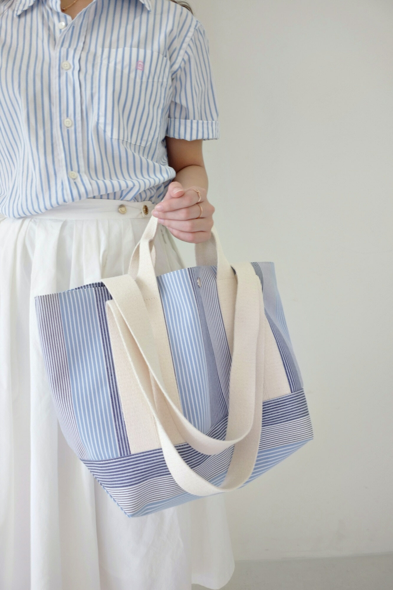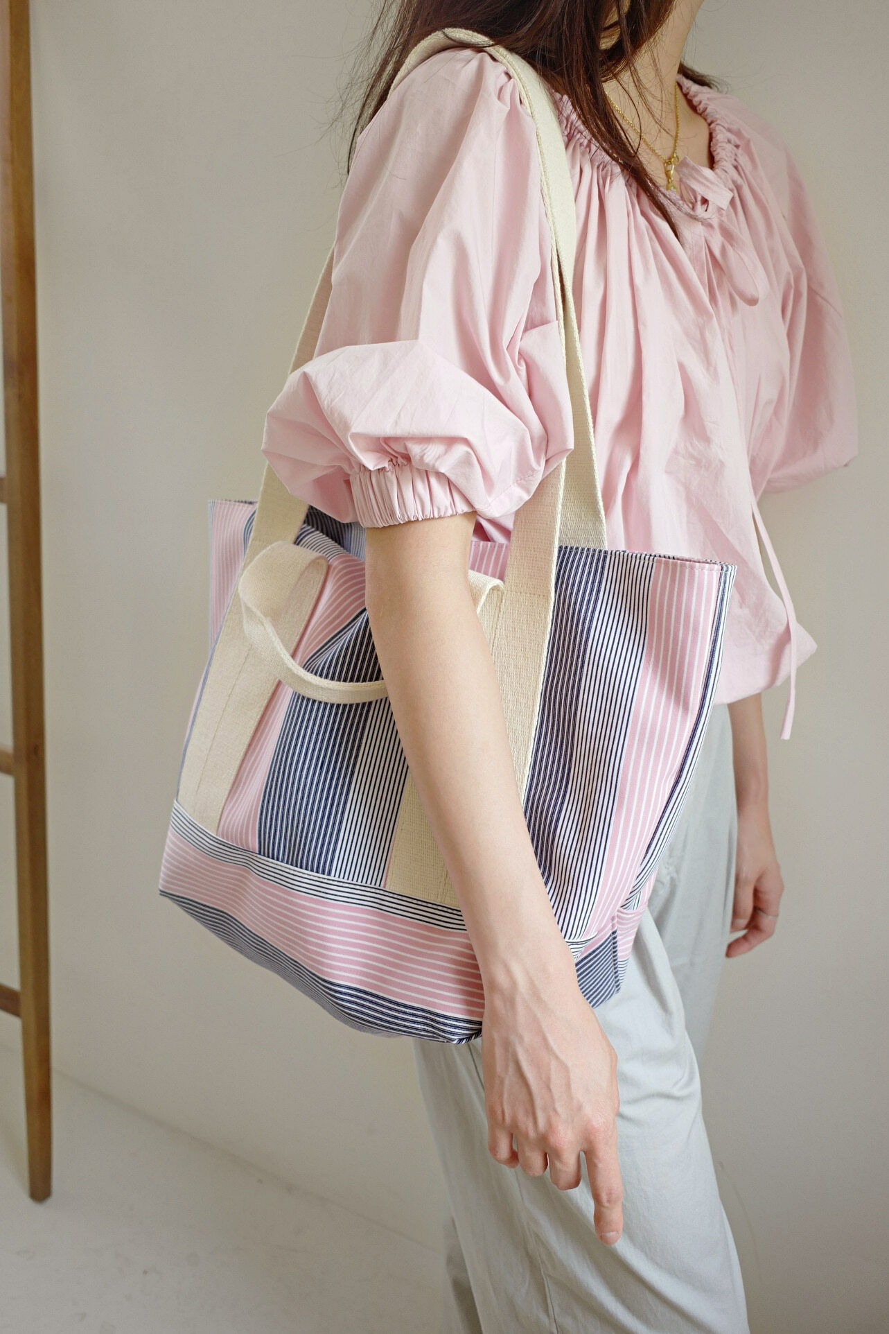 佢布料係韓國訂製,用上不同既條子布織出黎